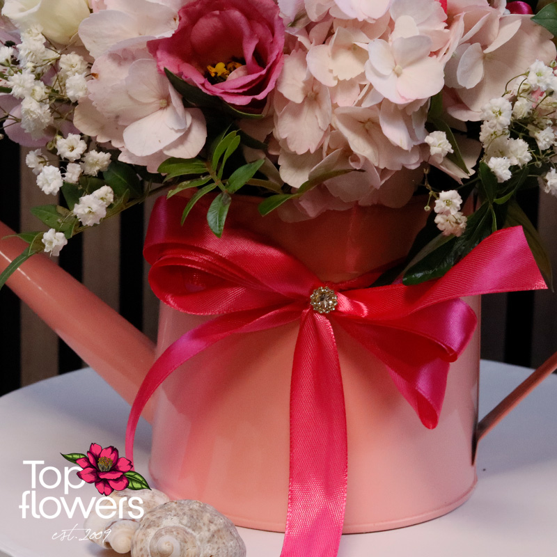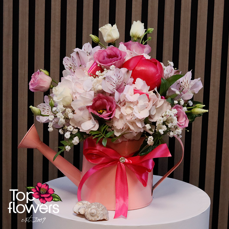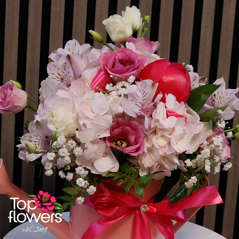 С мисълта за теб е нежна и романтична аранжировка, създадена за онези моменти, когато искате да кажете много с красив жест. В тази стилна композиция хортензия, божур, еустома и алстромерия се съчетават хармонично в декоративна лейка, превръщайки цветята в послание на внимание, обич и топлина.