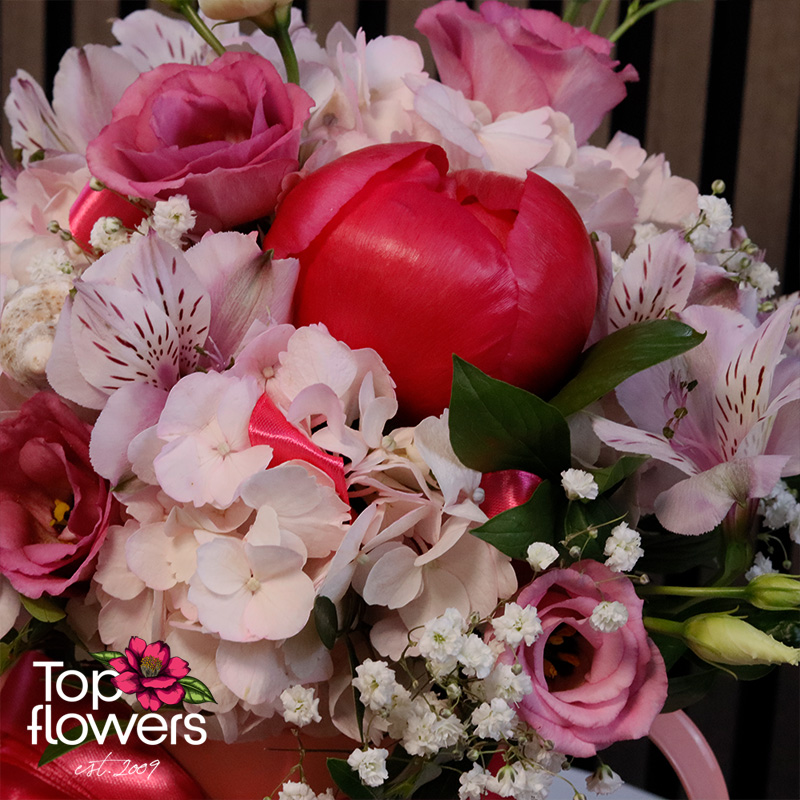 Хортензията носи усещане за изобилие, благодарност и искреност. Божурът символизира щастие, красота и нежни чувства, а еустомата добавя финес и елегантност. Алстромерията е цвете на приятелството и близостта, което прави тази аранжировка чудесен избор както за любим човек, така и за скъп приятел или специална дама.