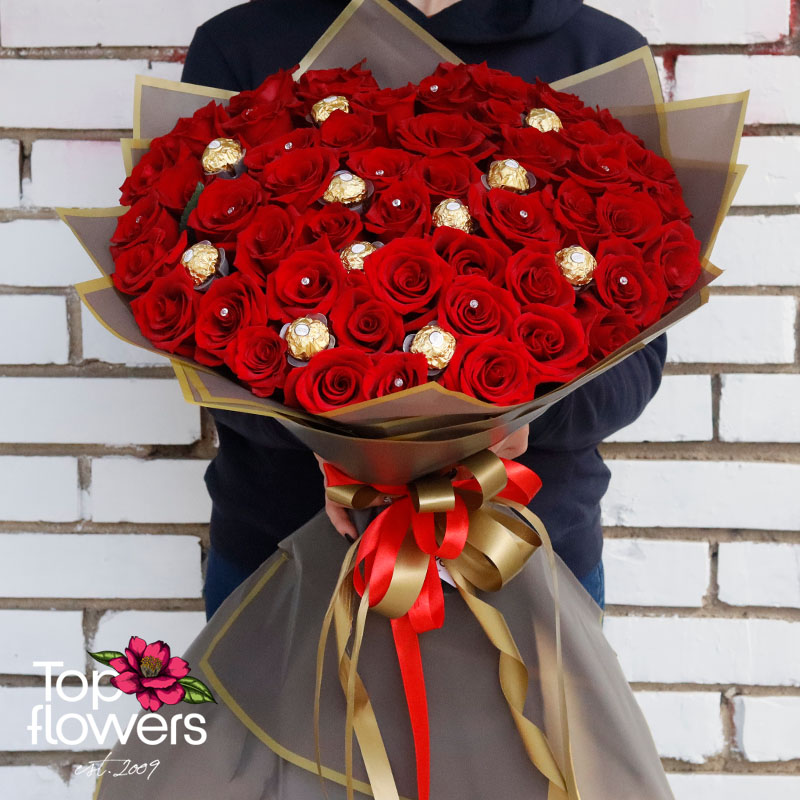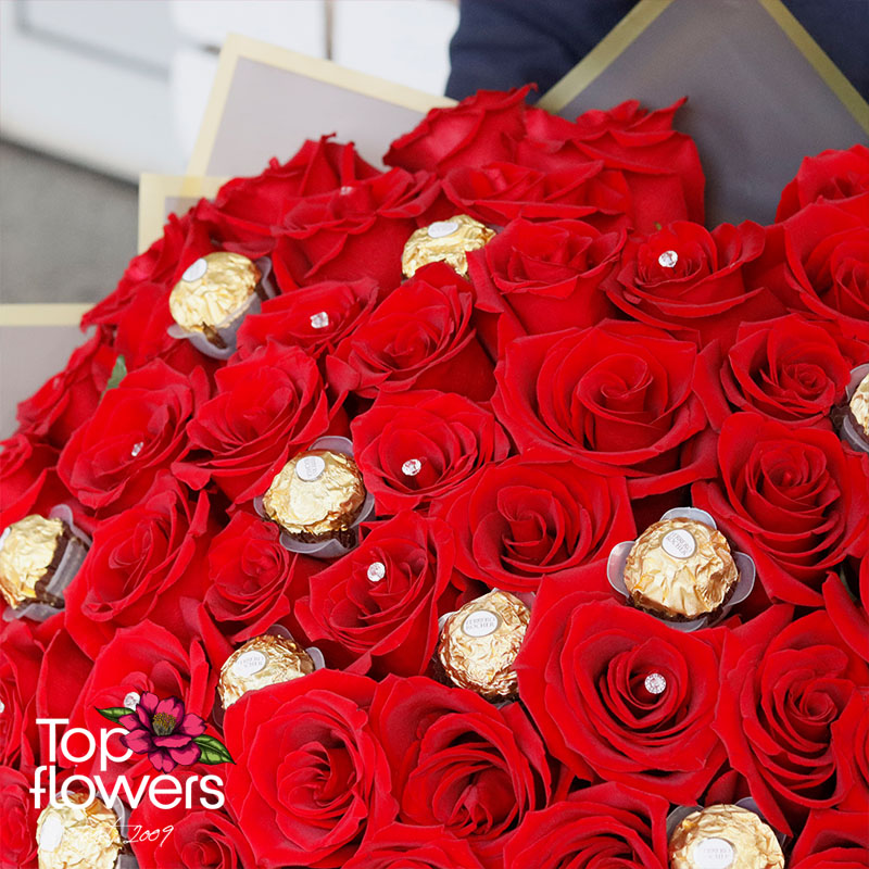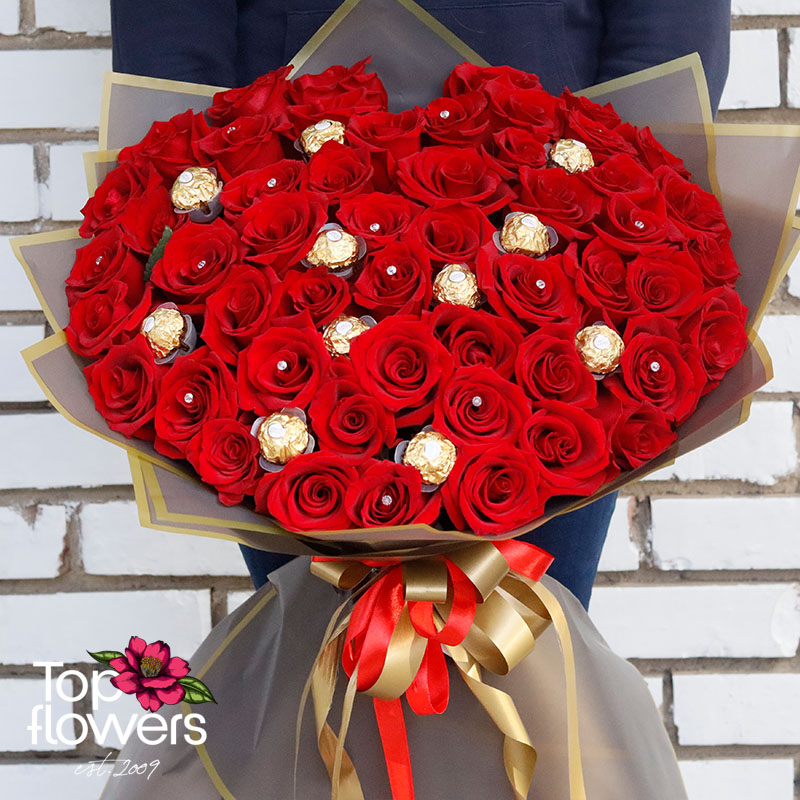 Букетът "Сърце в букет" е истински шедьовър на романтиката и елегантността. Всяка червена роза, внимателно подбрана и аранжирана във формата на сърце, символизира страст, любов и дълбока привързаност. Между разкошните цветове са вплетени фини "кристали", които добавят искрящ акцент и усещане за лукс. Завършекът на тази впечатляваща композиция са неустоимите бонбони Ferrero Rocher, които носят сладост и изисканост. Този букет е перфектният подарък за специален човек, израз на любов, внимание и неподправена красота.