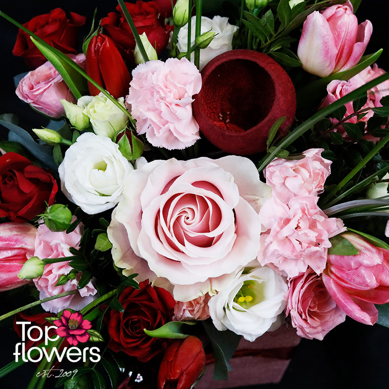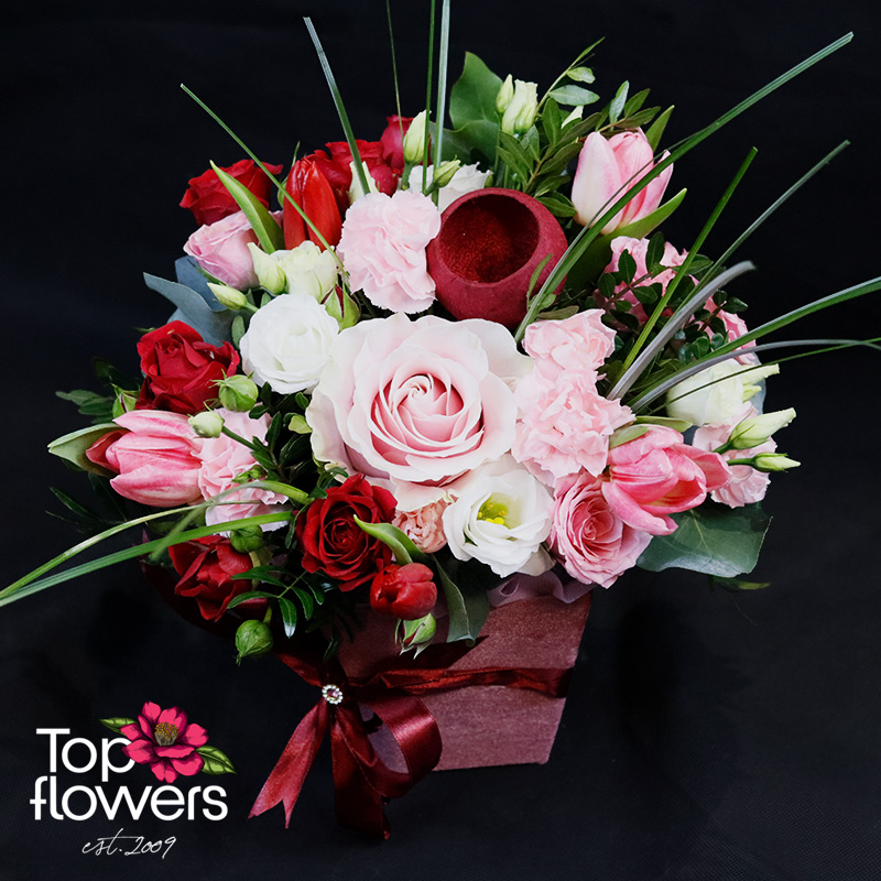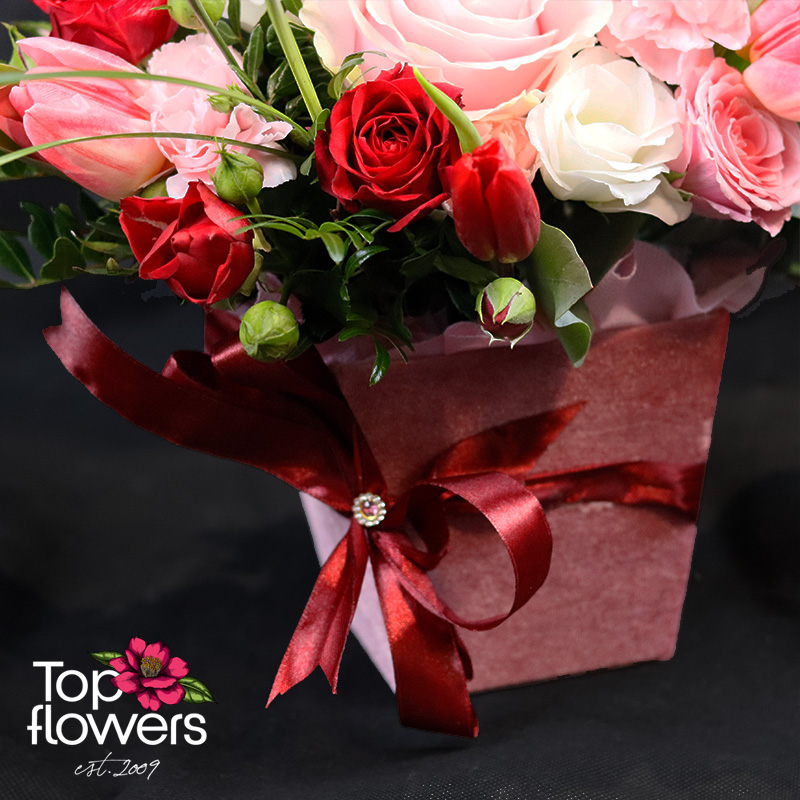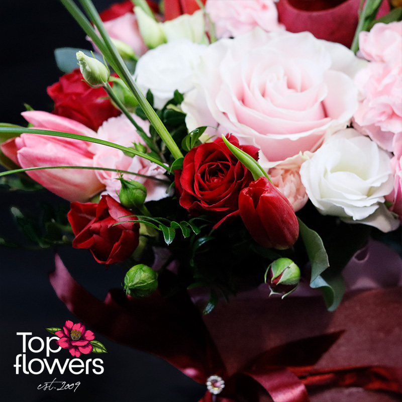 Розата е символ на любовта, лалетата носят усещане за ново начало, а еустомата добавя финес и лекота. Мини розите и карамфилът създават обем и дълбочина, превръщайки композицията в завършен жест с характер.