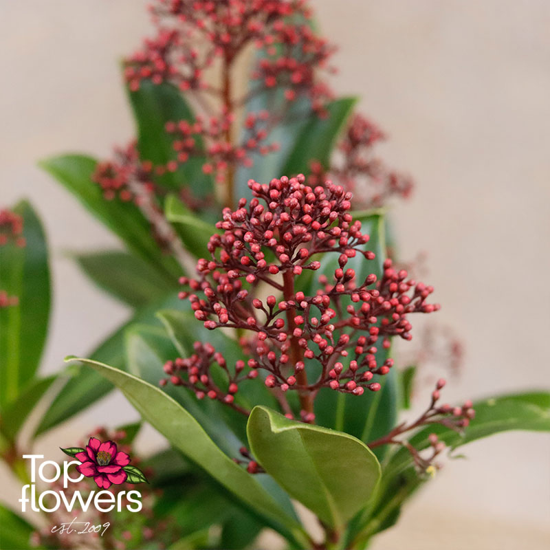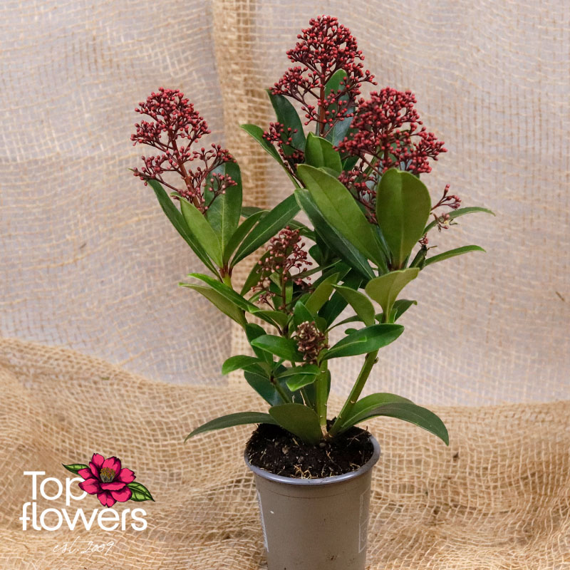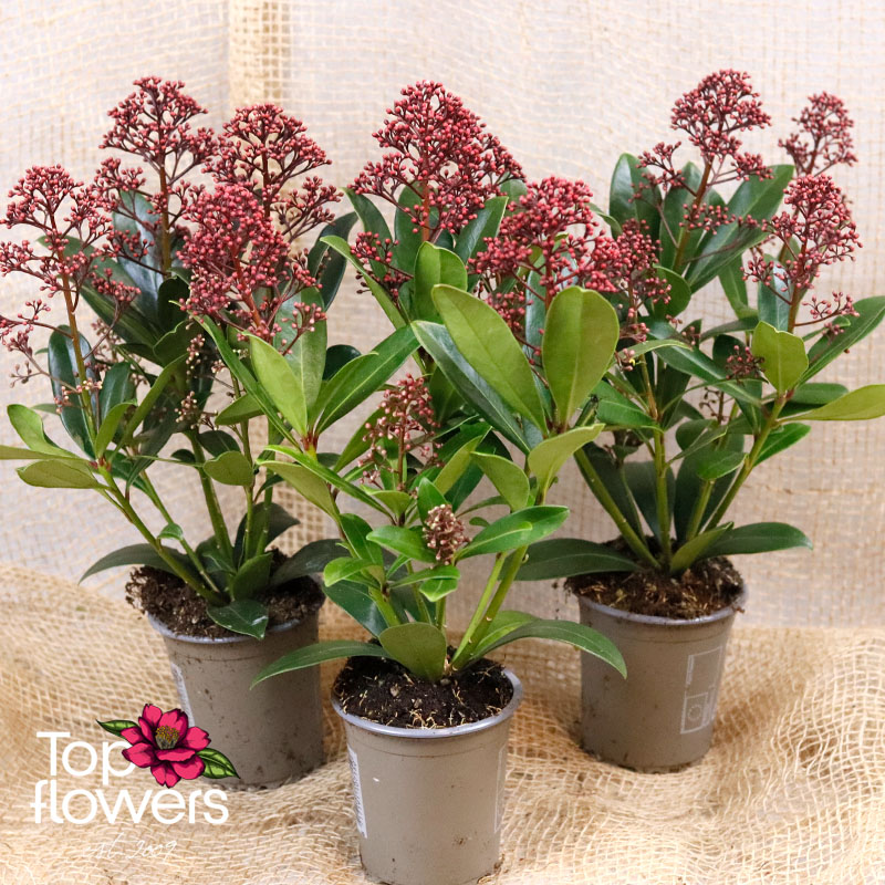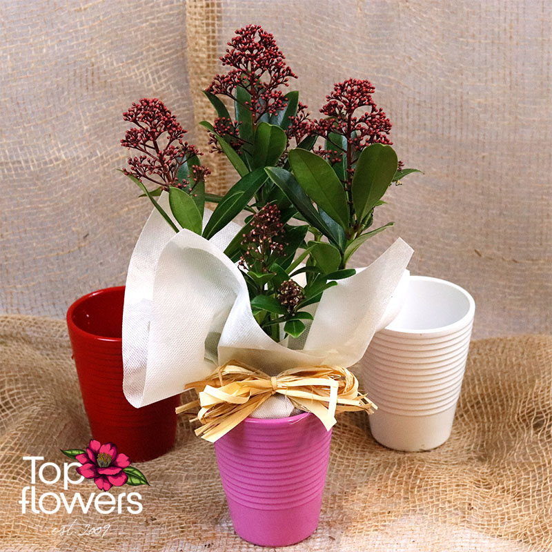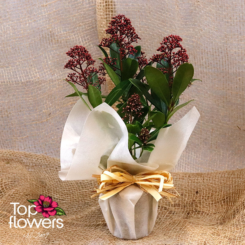 Независимо дали ще я изберете с транспортна саксия, подаръчна опаковка или в керамична кашпа – всяка Скимия в магазин за цветя Top Flowers се подбира внимателно и се подготвя с любов.
