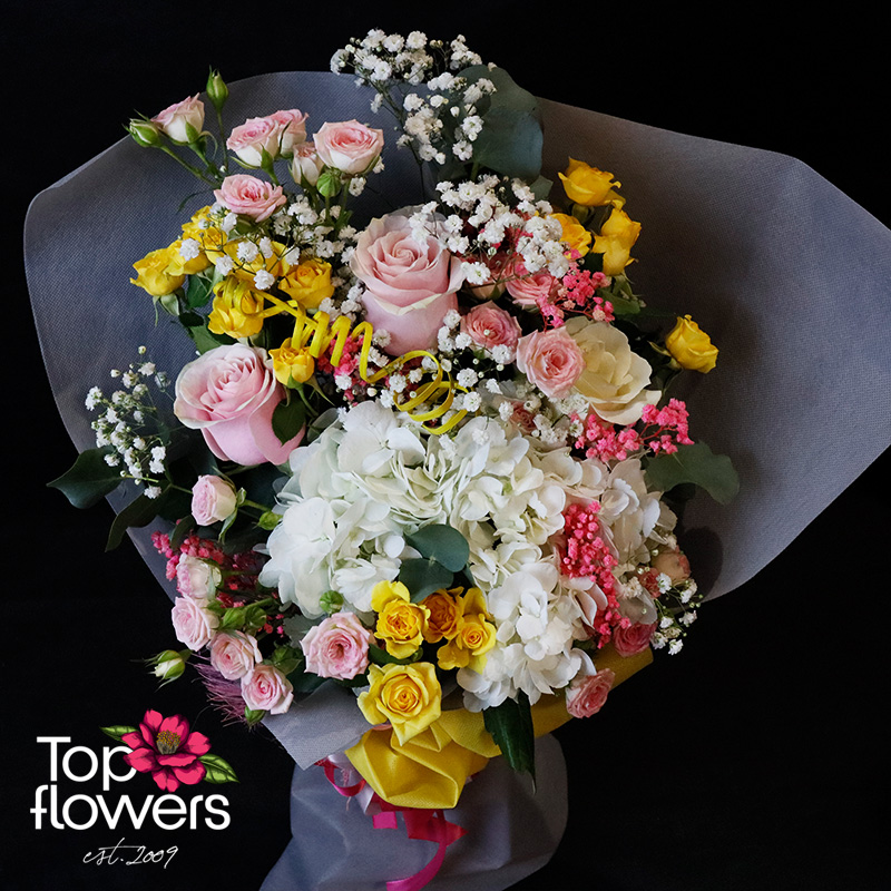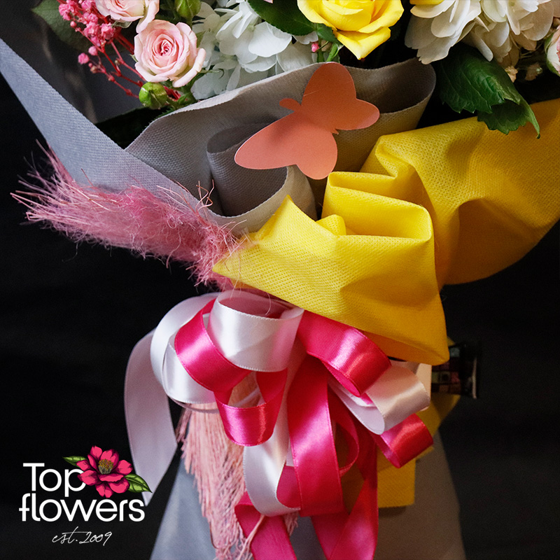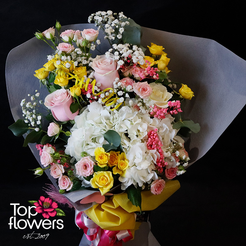 Сладко вълнение е букет, който говори тихо, но остава дълго в съзнанието. Нежна композиция от хортензия, еквадорски рози и мини рози, събрани в хармония от пастелни нюанси и свежи акценти. Това е онзи тип цветя, които не крещят, а галят - подходящи за моменти на радост, благодарност или просто желание да зарадвате без повод.