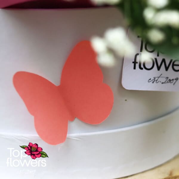 Представена в стилна бяла кутия, усмихнато допълнена с изящна хартиена пеперуда, тази аранжировка е повод за възхищение. Ароматът и цветовете съчетани с внимание към детайла правят този букет не просто подарък, а изживяване от изящество и чувственост. Подходящ за всякакъв повод, където желаете да подчертаете уникалността на специалния момент.