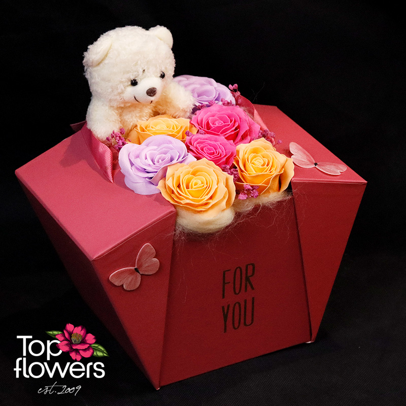 Тази композиция не е просто красива – тя е символ. Символ на грижа, внимание и топлина. Розите създават усещане за нежност и романтика, а фините декоративни елементи и елегантната кутия придават завършен и луксозен вид. Подходяща е както за романтични поводи, така и за подарък към близък човек, приятел или дете – когато искате да подарите нещо различно и запомнящо се.
