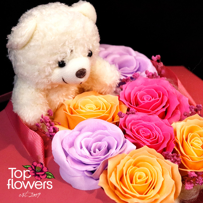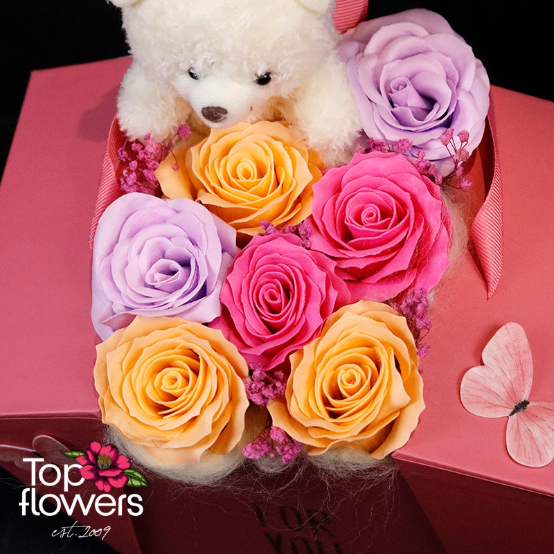 Понякога най-топлите жестове не се казват с думи… те се усещат. „Цветна прегръдка“ е онзи подарък, който носи усмивка още при първия поглед – нежен, цветен и изпълнен с емоция. Съчетава сапунени рози в меки и жизнерадостни нюанси, допълнени от сладко плюшено мече, което сякаш прегръща всяко цвете и всяко послание, което искате да изпратите.