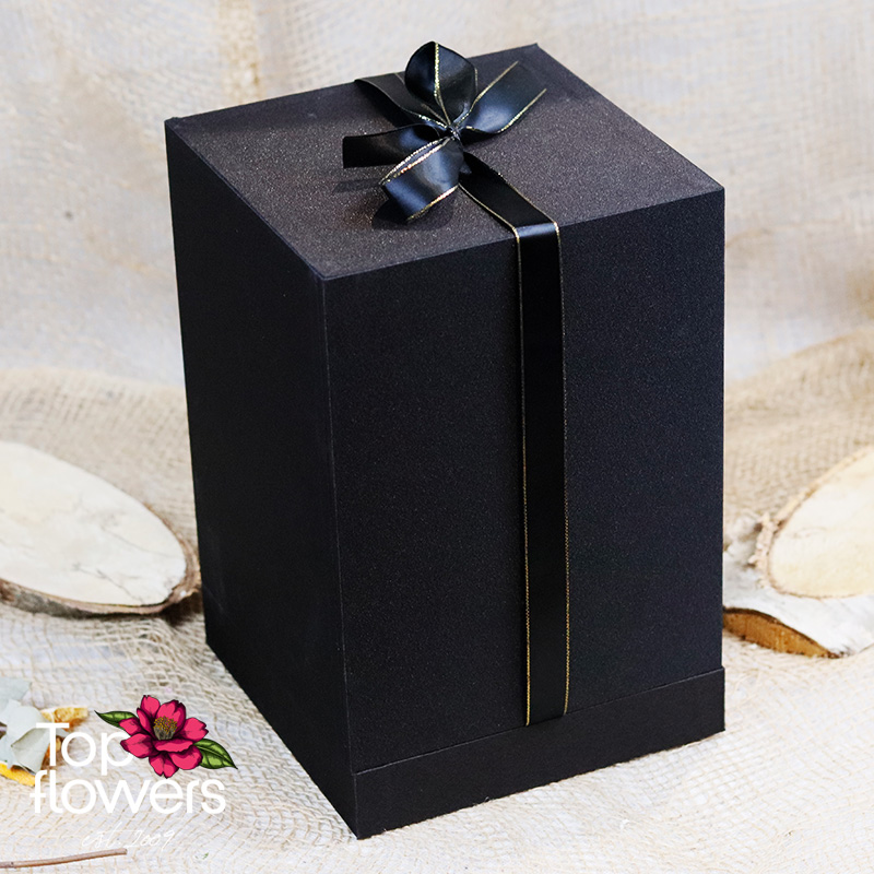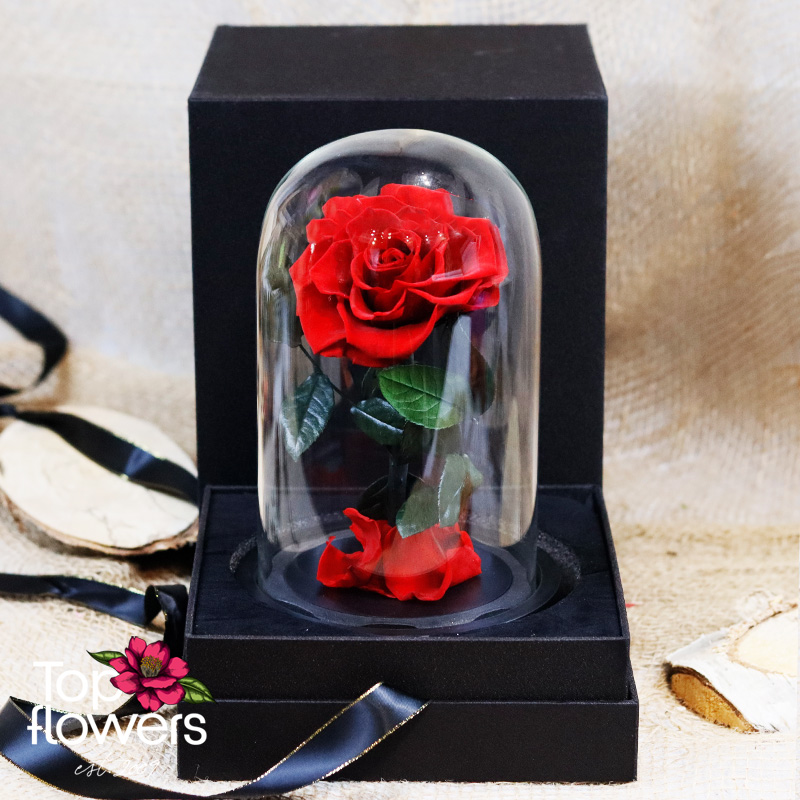 Поставена под елегантен прозрачен купол, розата изглежда като малко съкровище – защитена, изискана и впечатляваща. Черната луксозна кутия и сатенената панделка допълват визията с усещане за стил и класа, което прави този продукт идеален за специални поводи или когато искате да направите силно впечатление.