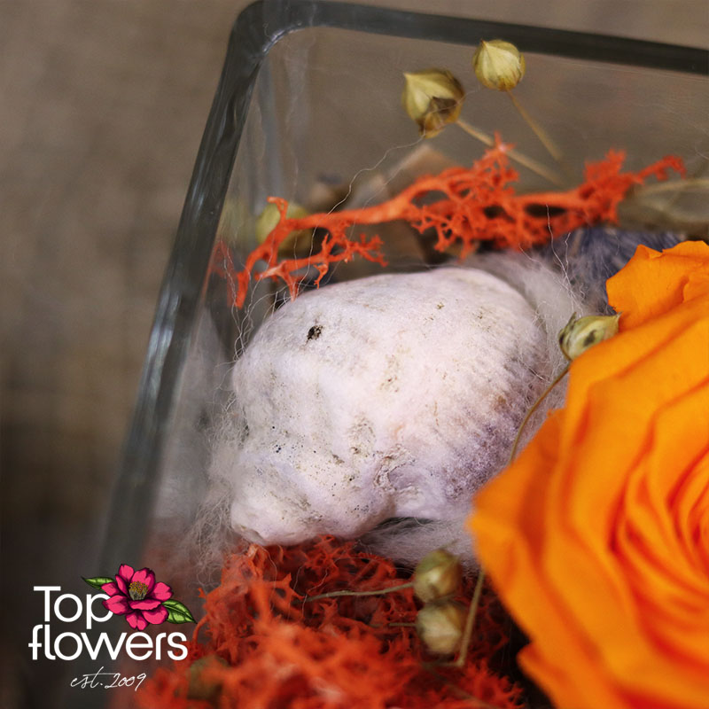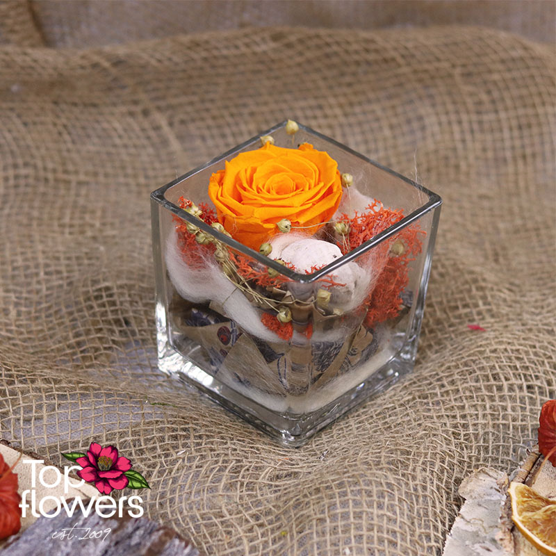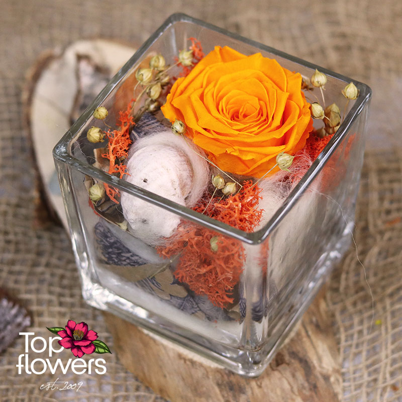 Понякога един цвят казва повече от хиляди думи… Тази вечна роза в наситено оранжево носи топлина, енергия и настроение – като малко парче слънце, затворено в стъкло. Нежно подредена със скандинавски мъх, памук и естествени декоративни елементи, тя създава усещане за уют и естествена красота.