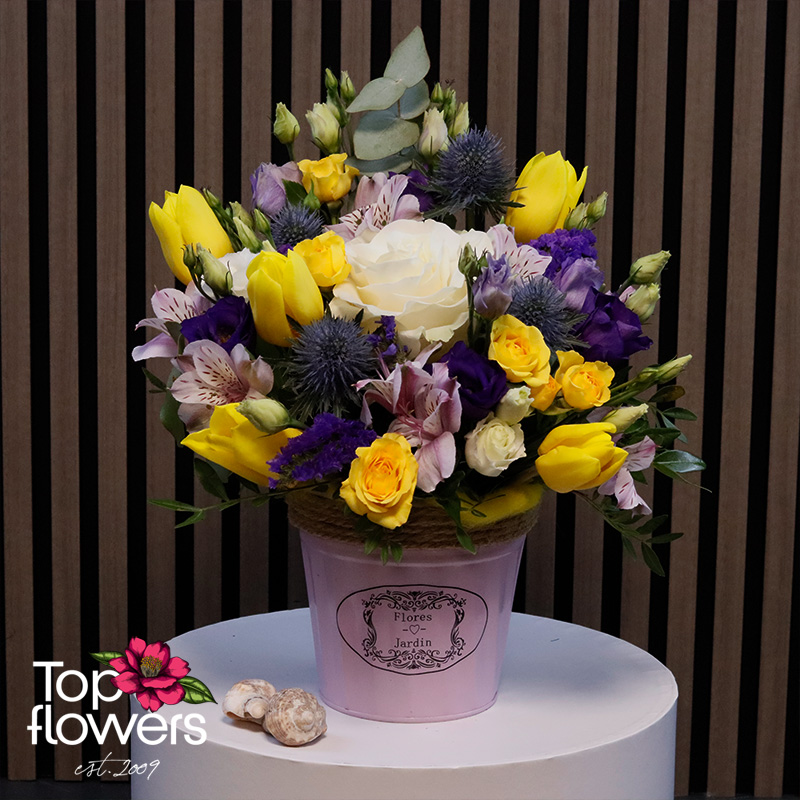 Виолетова соната е цветна аранжировка с характер - нежна, свежа и едновременно с това достатъчно ярка, за да превърне всеки повод в специален момент. В нея се преплитат роза, лалета, мини рози, алстромерия и еустома, подредени в декоративна метална кофичка с внимание към всеки детайл.