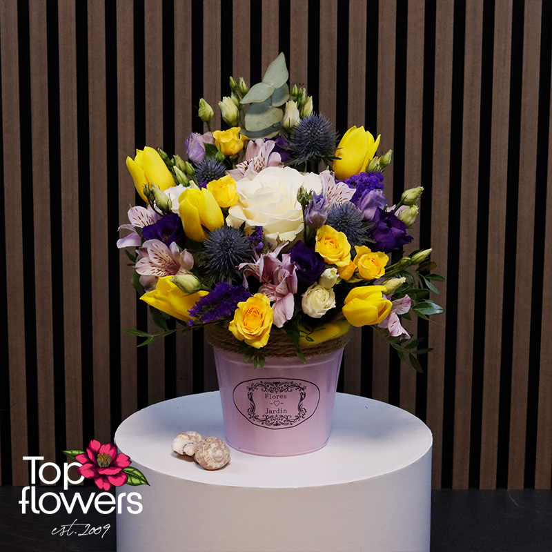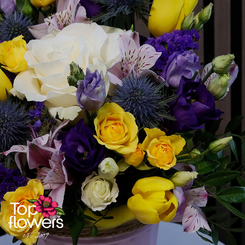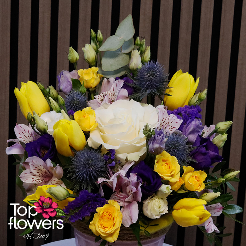 Жълтите лалета и мини рози носят усещане за радост, светлина и добро настроение, а виолетовите нюанси добавят дълбочина, стил и лека загадъчност. Бялата роза в центъра внася чистота, елегантност и онова красиво усещане, че подаръкът е избран с мисъл. Това не е просто аранжировка от цветя, а малка цветна история - за благодарност, обич, изненада или празник.