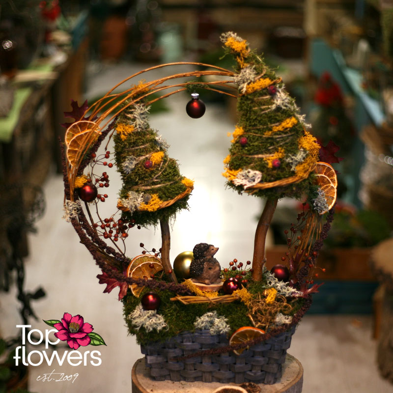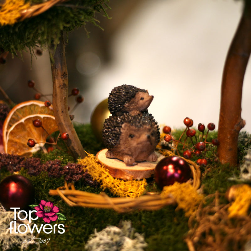 „Горска Мистерия“ е от онези арт инсталации, които не просто украсяват дома - те разказват история. Представете си малка скрита поляна, в която горски мъх, изсушени плодове и декоративни елементи се преплитат като сцена от зимна приказка. В нашия магазин за цветя често казваме, че магията се крие в детайла… а тук всеки детайл говори. Малките таралежчета сякаш току-що са изскочили изпод листата, а двата мъхести силуета на елхички създават усещане за дълбока гора и празнична тишина.
