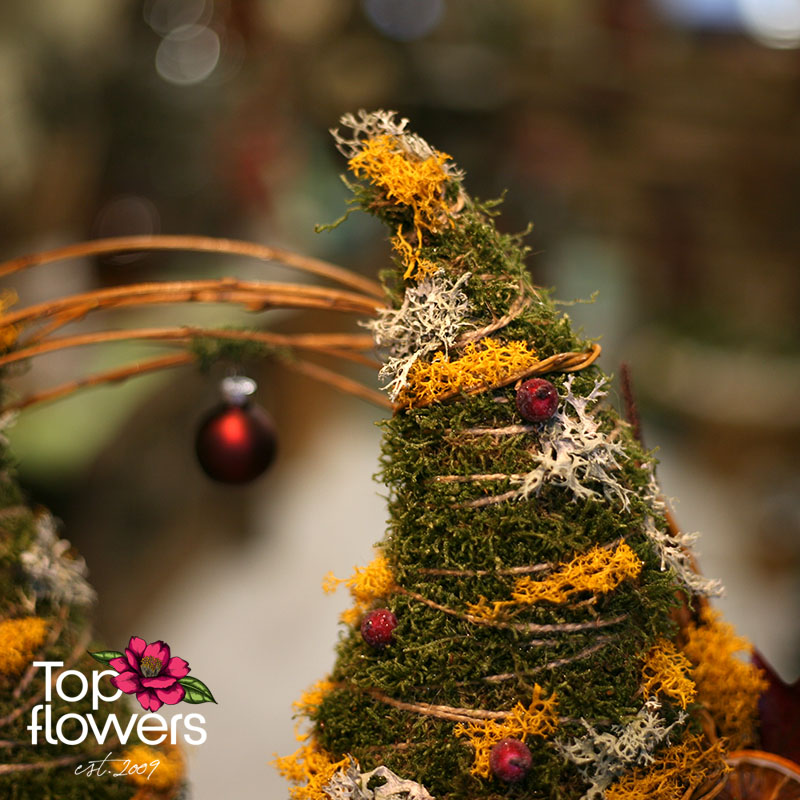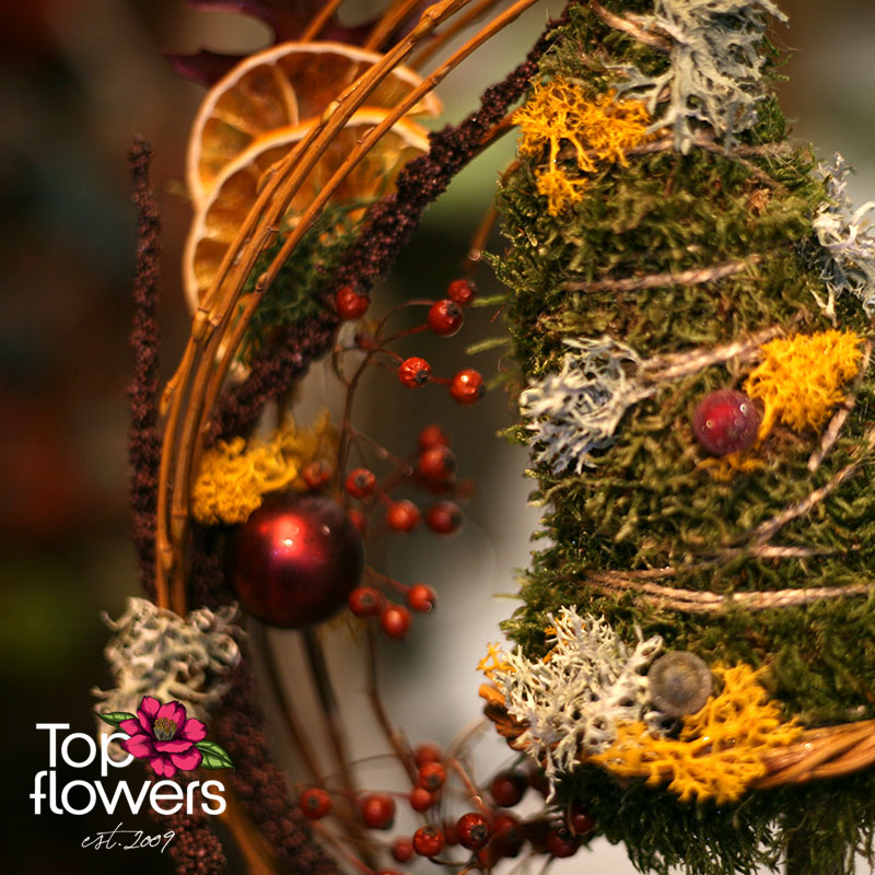Композицията е изградена изцяло от сухи естествени материали - горски мъх, шишарки, лишеи, плодови резени. Това не е просто декорация, а арт предмет, който остава красив години наред без поддръжка. Идеален подарък за дом, офис или като изненада с доставка на цветя, когато искате нещо различно от традиционното.